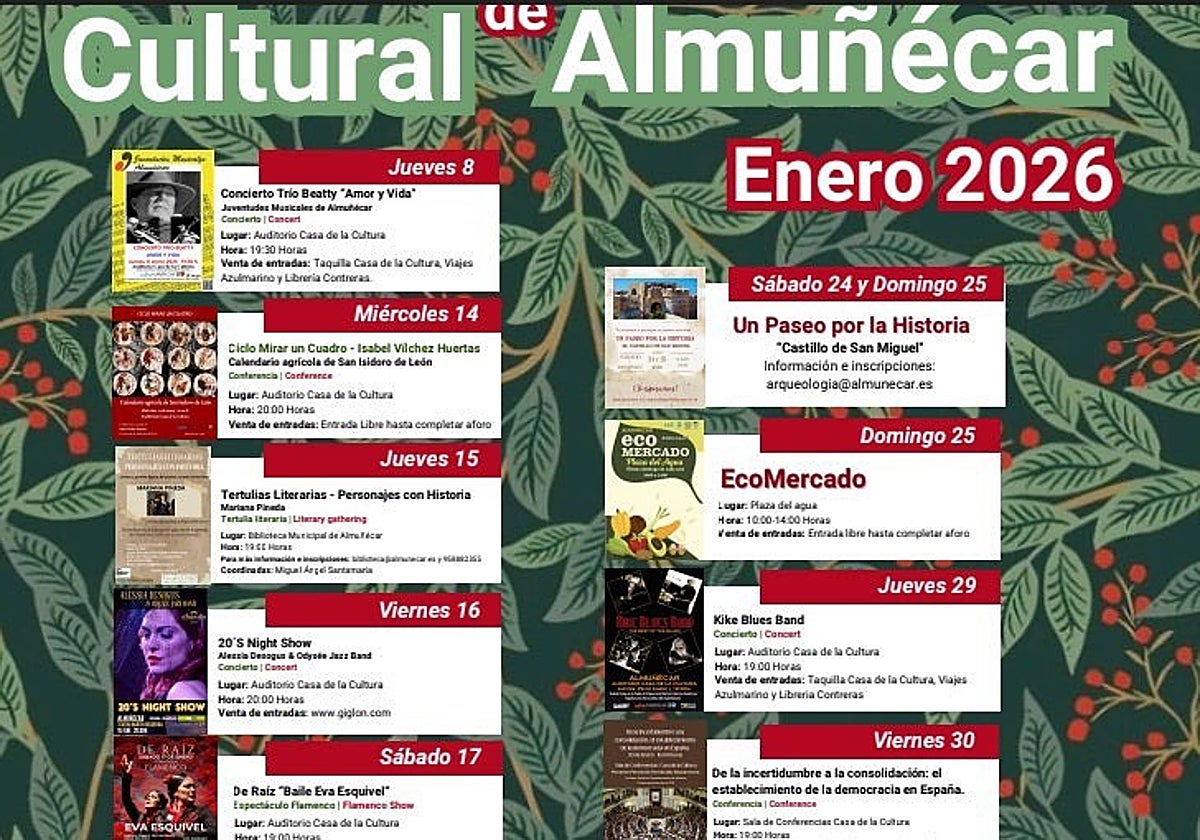 The department of culture of Almuñécar town hall has launched its cultural agenda for January 2026, offering a packed programme designed for all audiences. It brings together music, literature, theatre, cinema and opportunities to learn about the town's history and heritage in different spaces.