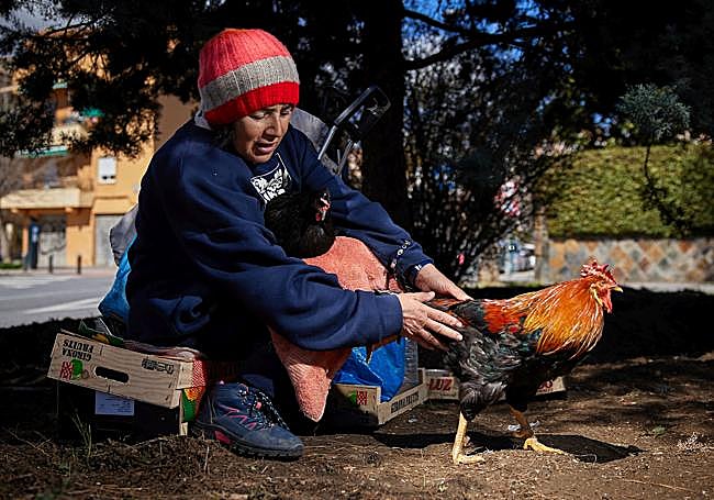 Fátima is wearing a blue tracksuit and hiking boots. Her short hair is covered by a woollen cap that makes her eyes look small. Sisi, the hen, is so black that she looks like a shadow. Piti, the rooster stands tall and proud, with orange, red and cobalt feathers. "Mmmm, mmm, mmmm," the woman keeps crooning.