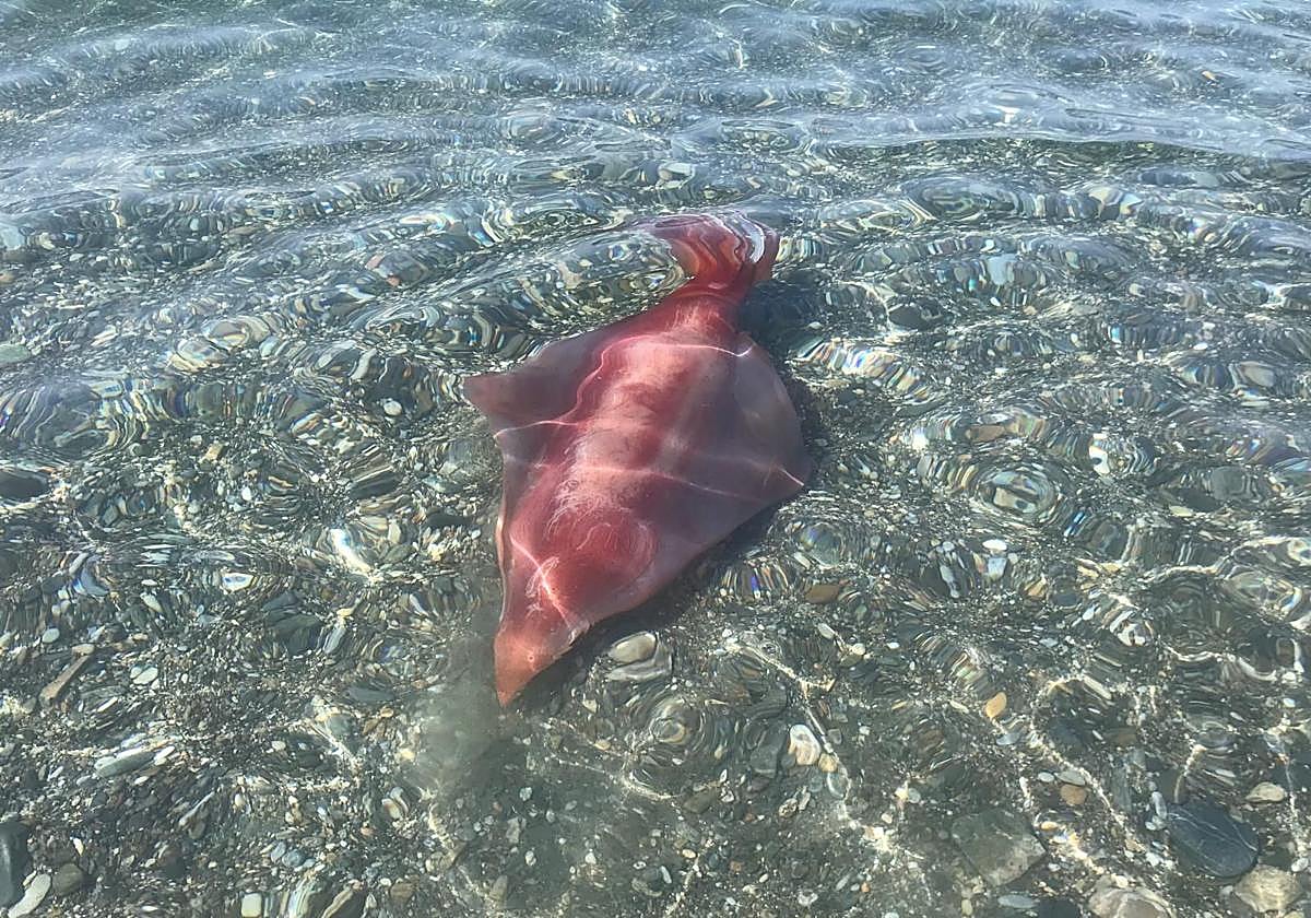 A 'giant' squid surprised bathers and beachgoers alike as they were enjoying a day at Playa Granada in Motril on a hot Tuesday in August. This large mollusc with a striking pink colour soon became the centre of attention. Several people quickly approached the shoreline to take in this rare sight of such a specimen in the waters off Motril along the Granada coastline.