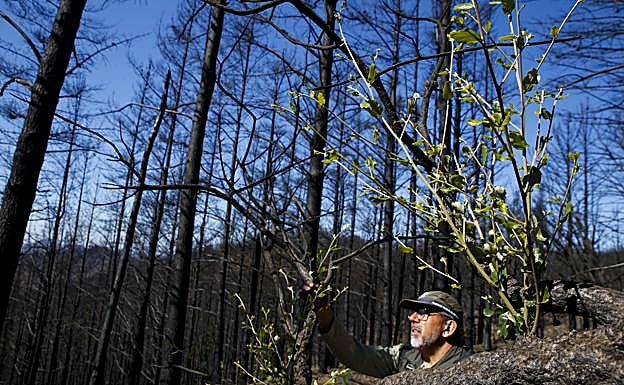 The search for more green shoots takes Pepe down a track that leads to a change in vegetation. Instead of pine trees, there are cork oaks, stained black but with new stems appearing near the top. "This part of the woods will regenerate faster," says Antonio. Paradoxically as it may seem, now that there are fewer trees, the new ones will be able to grow more vigorously. It's a question of maths. There are fewer roots in a soil that now offers a lot of nutrients. "The cork forests will recover, we can see that already. If it had rained, this would be even greener," he says.