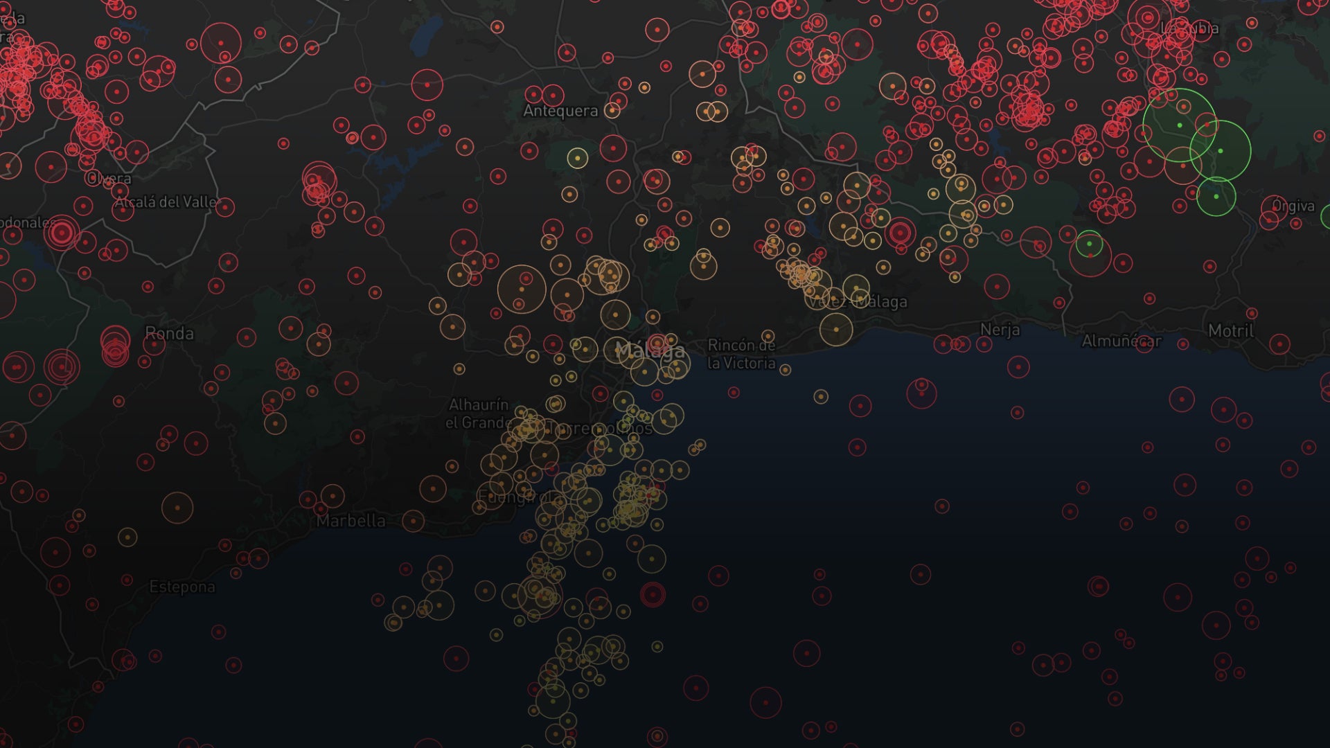 The area of Granada is not only one of the areas with the highest concentration of earthquakes, but also the majority of these earthquakes have a shallow depth (hypocentre at a depth of less than 70 kilometres). The area of Malaga with the highest concentration of epicentres is on the west coast (around the maritime-terrestrial limit of Fuengirola, Benalmádena and Torremolinos), although they are earthquakes of intermediate depth (70-300 kilometres).