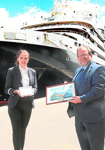 Minister John Cortes was in the Port of Gibraltar on Wednesday to welcome the Le Dumont D'Urville cruise ship on its inaugural visit to the Rock. Cortes, standing in for Tourism Minister Vijay Daryanani, exchanged plaques with Le Dumont D'Urville's hotel manager, Sami Saidi and chief purser, Karina Smereczinski. The ship, carrying 92 passengers and 110 crew members, left later that evening for its next port of call, Malaga.