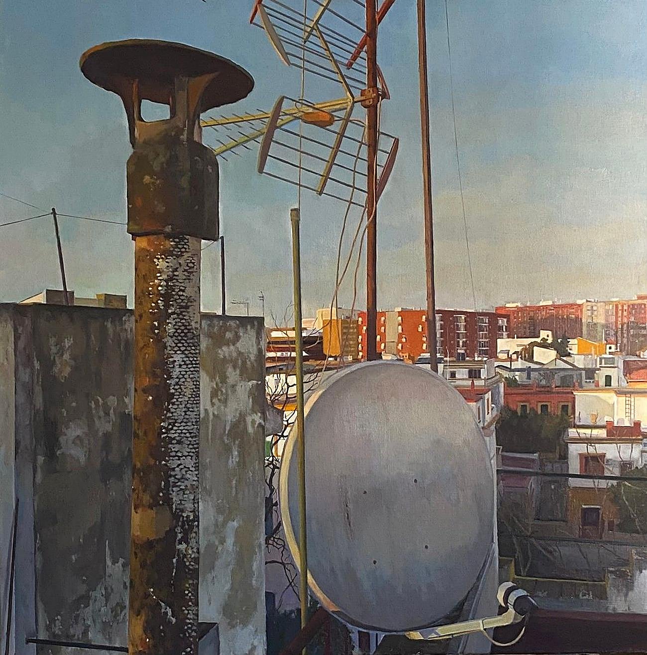 His winning work depicts a Seville rooftop at sunset. "Like my other works, it represents a lived landscape," he said. "I fell in love with the evening light." The painting's title came from a family member who noticed two elements in the foreground. Though Don Quixote never ventured beyond Sierra Morena in Cervantes' novel, Seville does appear in the famous work, with the knight declaring it "a place so suitable for finding adventure that more adventures present themselves on each corner than anywhere else."