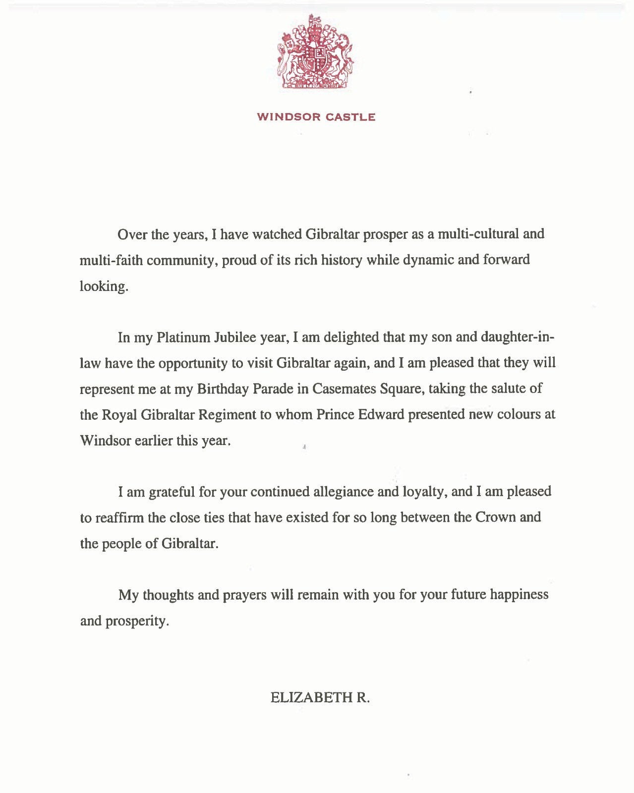 In my Platinum Jubilee year, I am delighted that my son and daughter-in-law have the opportunity to visit Gibraltar again, and I am pleased that they will represent me at my Birthday Parade in Casemates Square, taking the salute of the Royal Gibraltar Regiment to whom Prince Edward presented new colours at Windsor earlier this year.