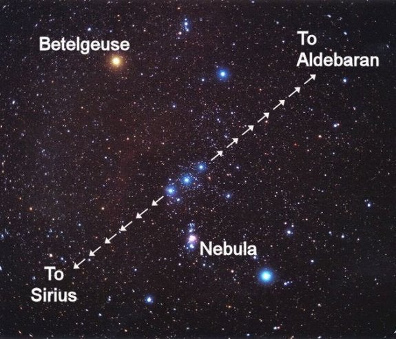 The three stars that form a perfect straight line mark Orion's belt across his waist. If you look very carefully just below his belt where his sword would hang, you should be able to notice that the stars in this area have a slight 'fuzzy' appearance. This is the Orion nebula; a huge area of mainly hydrogen gas where new stars are being formed. Even with just binoculars the gas cloud can be easily seen, but photographs taken with the Hubble Space Telescope have shown incredibly complex regions inside the nebula as the gases are condensing together to form stars. It has been calculated that the nebula is over 200 light years across and over 1,400 light years from the Earth.