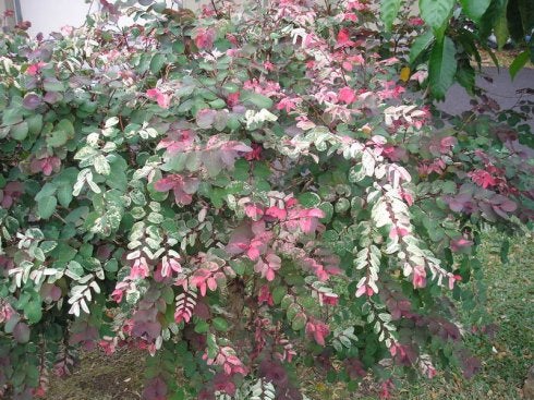 The plant genus Breynia includes around 35 species of evergreen shrubs. The most popular of which are the colourful variegated forms as the tiny greenish flowers are virtually invisible. The oval leaves form in flattened, frond-like sprays on pink or red 'zig-zag' stems and depending on the species, can be all green or mottled with white, pink or red. Common names include Snow on the Mountain, Snow bush and Ice-cream bush.