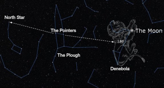 To help you find it, the Moon will be very close to Regulus on 10 March. The rest of the body of the lion forms a rectangle of stars with the bright star Denobla at the lion's tail. At the moment, Leo is pointing head up with his tail pointed toward the horizon. Another way to easily find Leo is to locate the Plough. The two end stars of the Plough are called the pointers and can be used to point to the North Star. If you follow the pointers in the opposite direction then they point to Leo.