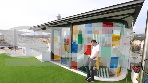 The Pompidou cube is there in the form of the door to and from the roof terrace. To the right we find the pergola from the Palmeral de las Sorpresas in the citys port and written on a table made to look like a bar is a chalked sum, the traditional way of working out the bill in Malagas famous wine bar Antigua Casa de la Guardia: it comes to 36, the addition of the date when he bought the property.