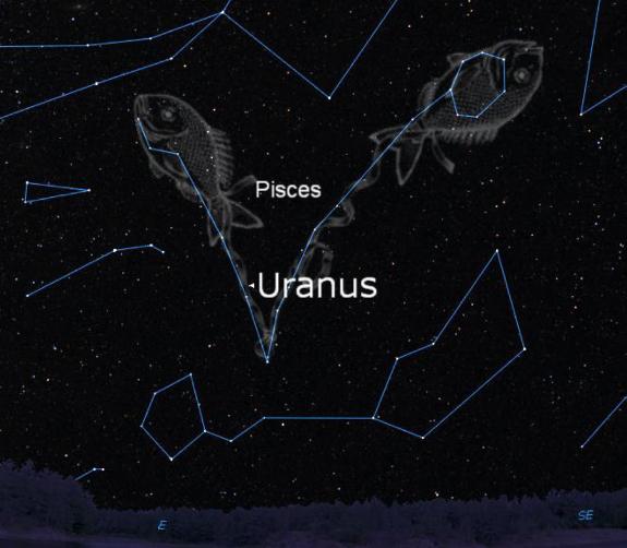 Uranus is easily visible with binoculars or small telescope if you know where to look. It rises in the east at around 8.30 and will be at its highest and due south by midnight. It is sitting right in the middle of the V shaped pattern of stars that form the constellation of Pisces.