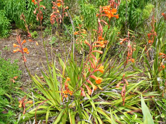 A striking clump-forming plant with lance-shaped leaves and spikes of orange tubular flowers similar to montbretia
