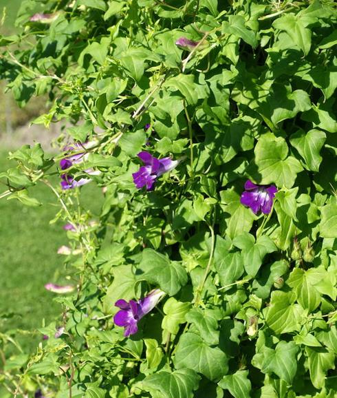 Maurandya barclayana is a woody, twining vine with large ivy-shaped leaves and trumpet-shaped purple and white flowers