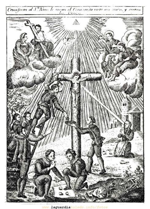 However, trial documents published much later showed that the accused and the witnesses, who were heard separately by the Inquisitors without being brought face-to-face, contradicted each other on a number of details (the age of the child, the names of his parents, the place of his birth and residence, and the place where the crime was supposedly committed). What's more, this child was missed nowhere, no body was ever found, nor the heart. They couldn't even agree on a name. He therefore became known as the Holy Child of La Guardia (El Santo Niño de La Guardia).