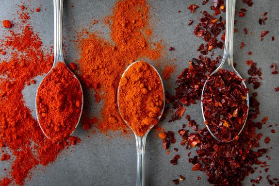 The peppers used to make paprika have little flesh and are rich in carotenoids such as capsanthin, capsorubin and beta-carotene, which give them the intense red colour of the sweet varieties. The hot varieties have an abundance of a defensive chemical, capsaicina, which is responsible for the burning sensation. The drying process concentrates these substances which dilute easily in contact with fats (carotenoids are liposoluble which is why they quickly colour other foods when fried with them).