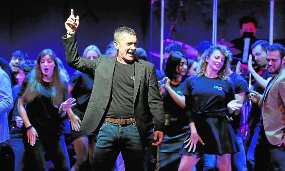 The curtain rose and backed by an orchestra and twenty artists on stage, Banderas sang a number from the musical Company, the next show to come to the theatre.