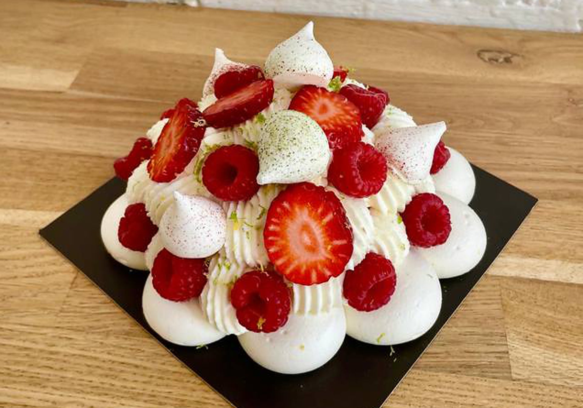 In season, in fact, they have it in the shop in individual format. They follow the classic recipe: "We make it with French meringue and bake it for four hours at a low temperature. We leave it in the oven overnight so that it hardens. Then we make a whipped cream with mascarpone. We add red berries with raspberry compote and fresh fruit on top.