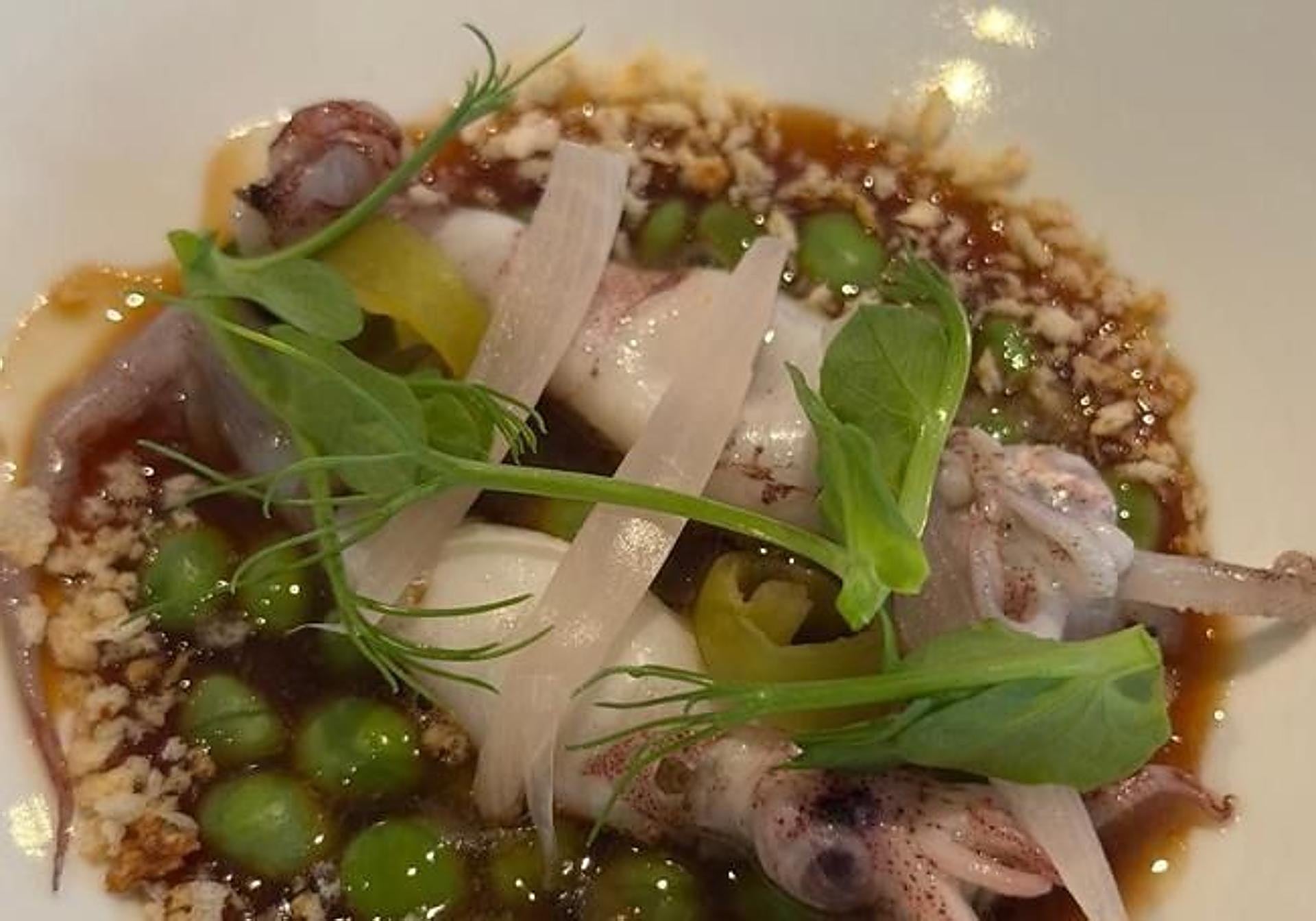 Tender peas accompanied with baby squid and a smooth sauce with cured ham.