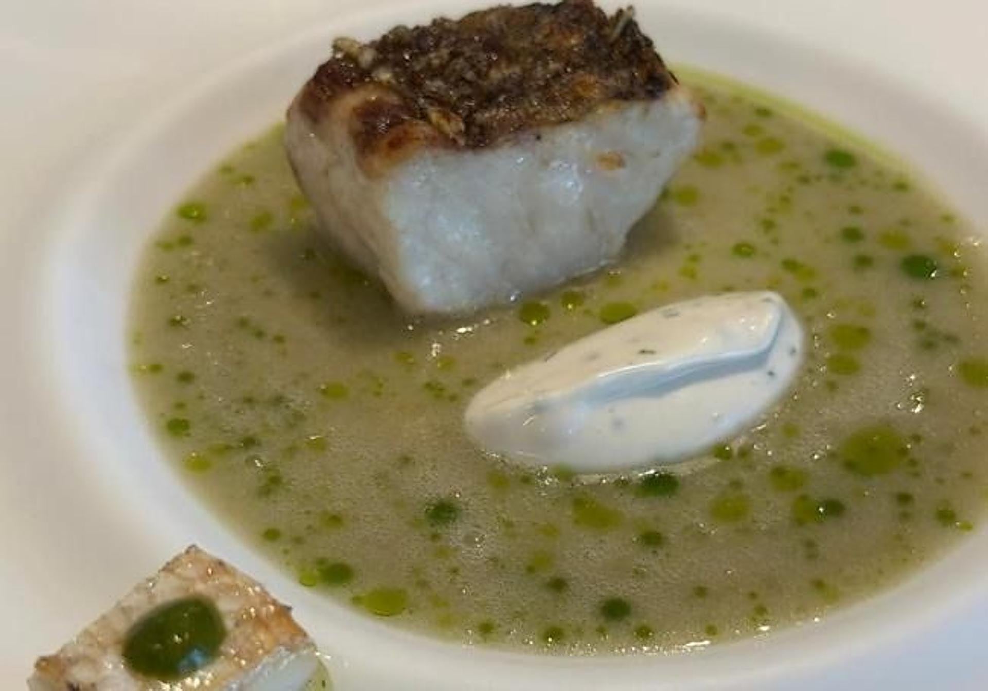 A good cut of fish with the skin. It arrives at the table on a base of fish sauce emulsified with the fat of the sea bass and clams. A soft, almost ethereal ice cream of fine herbs adds contrast to the dish.