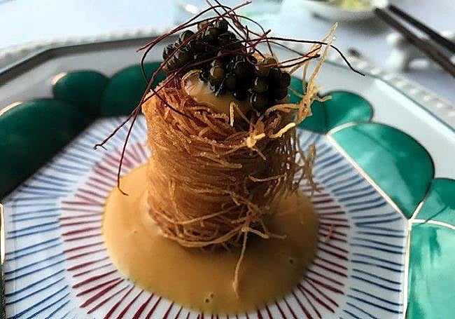 Crujiente de bogavante: The lobster is fried until it is a very crispy and a fine point on the palate. The caviar adds saltiness and reinforces its flavour, as does the passion fruit and mango sauce on which it sits, giving it a delicate sweetness.