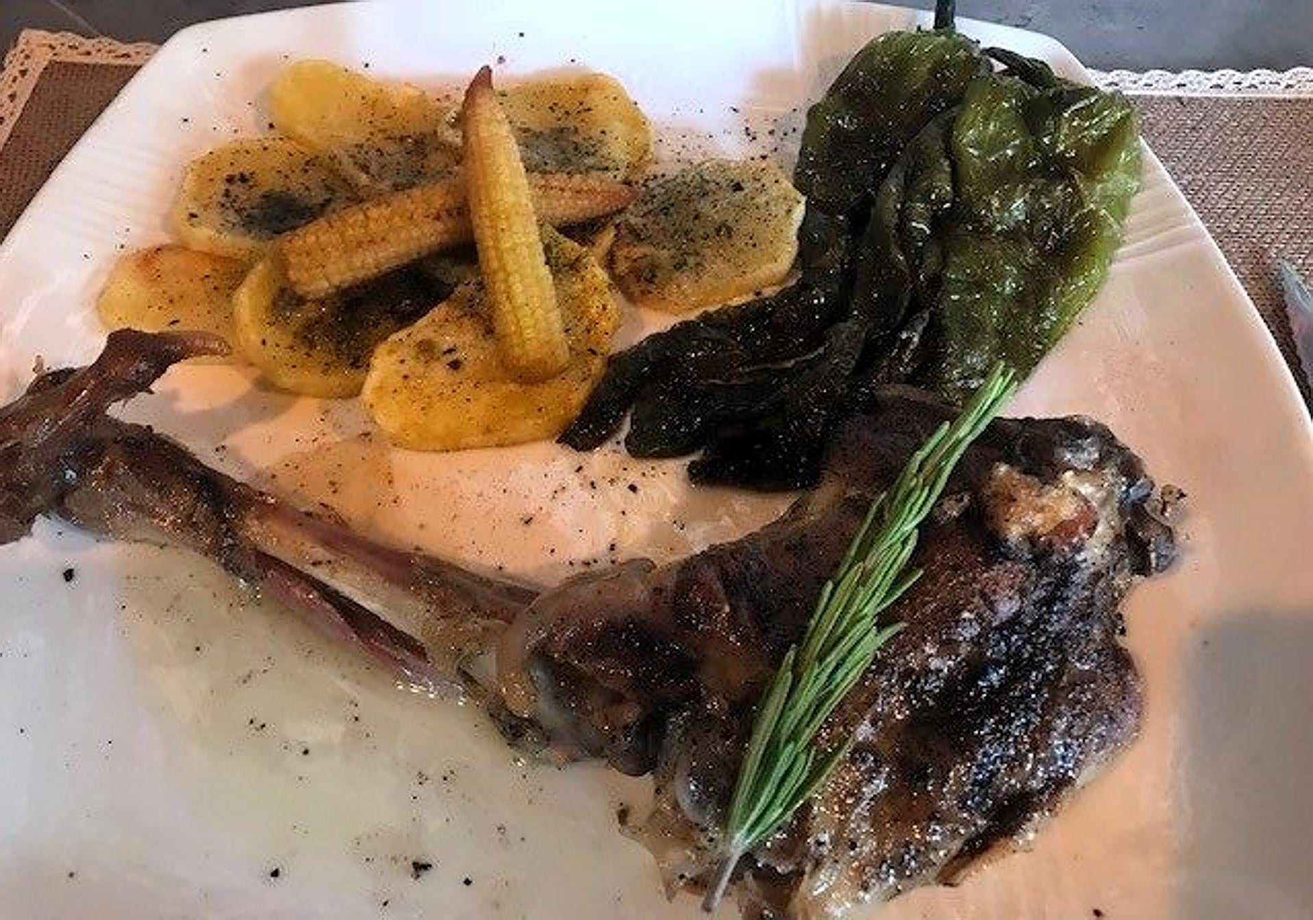 Prices: Patatas bravas: 6.50€; Entrecot: 25€; Leg of kid goat: 18€