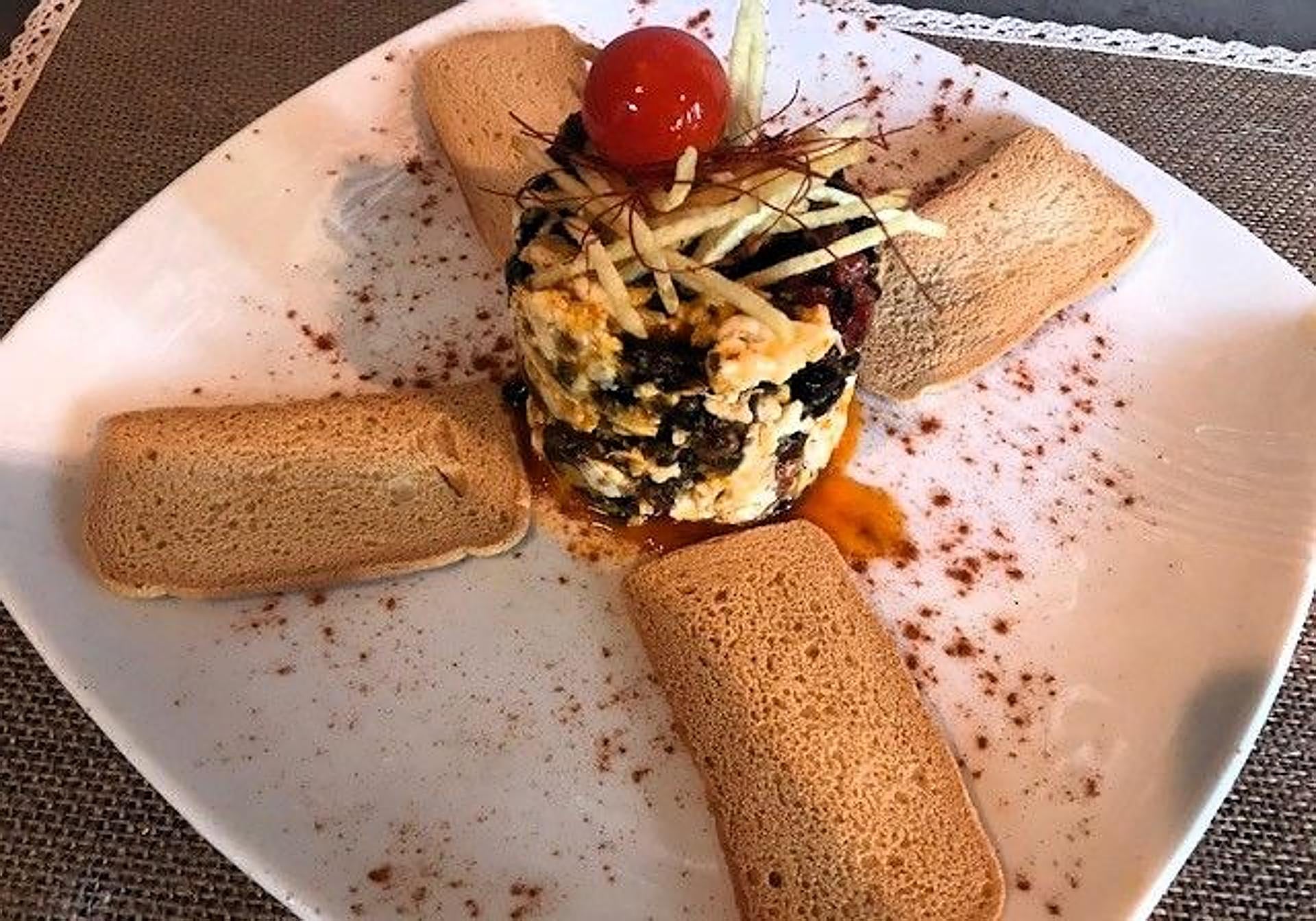 Revuelto de matanza: Interesting and visually appealing scrambled egg made with some of the classic sausages from the 'matanza' (annual killing of the pig), that is, blood sausage, paprika and small pieces of pork. Raúl should be more daring and present a scrambled egg where juiciness is present.