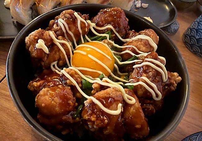 Not very big juicy pieces of chicken, in this case the thighs, fried Japanese style, i.e. barely browned on the outside and with a sauce based on different spices and with egg yolk as a common thread of flavour and texture.