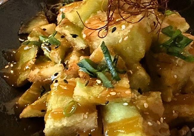 The first aubergines of the season are lightly fried and diced and then covered with a homemade miso sauce. In Edo, it has become one of the most popular warm starters.