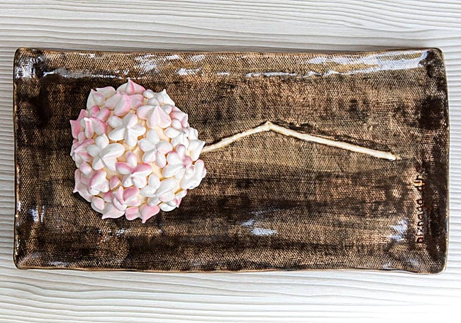 A must in any selection of desserts in Malaga. As eye-catching as it is famous, it never hurts to recall in case there's anyone who hasn't heard of it. Pepo Frade and María Scheller dedicate this little work of art of painstaking elaboration to the city, that is now in its sixth year and which emulates the typical Malaga biznaga flower. In this case, with white chocolate, mango, Malaga wine and crunchy almonds. The icing on the cake is the Italian meringue flowers, which Scheller makes and paints by hand. To top it all off, the dish that goes with it. There is even a surprise in store when you finish it.