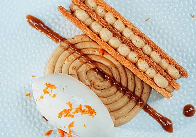 For Pablo Vega, the head of the Ménade kitchen, the sweet end of the menu is just as important as the savoury part. That is why it is difficult to choose when it comes to dessert at this restaurant in Velez. But, given the choice, there are several that stand out. On the one hand, the cheesecake with an Argudo goat briquette; the so-called 'Oops, I dropped my ice cream! (and to avoid spoilers, we will just say that it is violet ice cream, lemon cream and ginger); and the one in the picture here, called 'Málaga en una milhoja', a form of caramelised puff pastry, creamy orange, cinnamon, toasted almonds, sultanas and meringue milk. All with Malaga DNA.