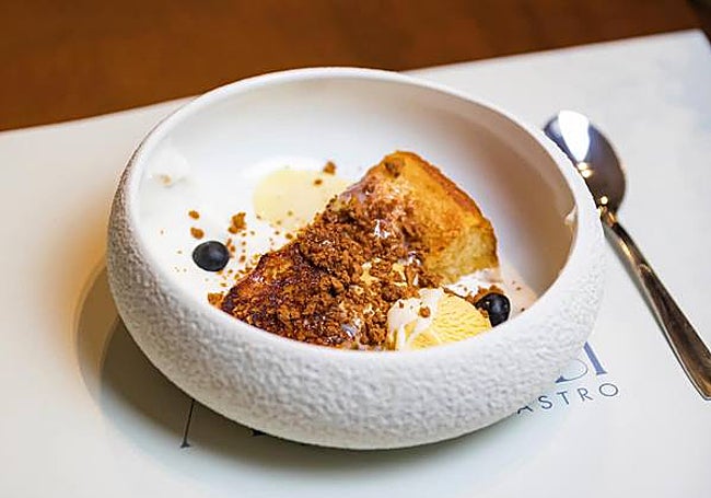 It is not easy to find this sweet British delicacy in these parts. It became popular in the 19th century in the form of sponge cakes soaked in sherry and brandy. Now Dani García is inspired by this recipe and somehow brings it to Marbella with his own touch. In this case, customers will find warm brioche soaked in vanilla and Baileys sauce with toasted butter ice cream. Some may be reminded of the tarta di rose served at Leña, its sibling. The difference is in the juiciness of the drunken sponge.
