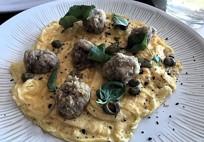 It was about time to be able to find offal (brain) on a menu. This is a delightful omelette where the brain has been battered and fried in advance. The balance between the almost curdled egg and the offal is unctuous, aromatic and with a very delicate flavour.