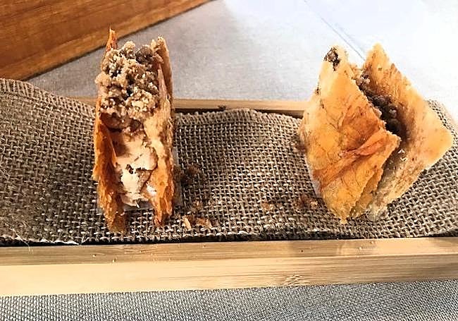 It is, at least for me, the most successful appetiser of the four served in the tasting menu, in terms of flavour and texture. Thin, crispy chicken skins are the two outer parts that preserve the fried and shredded chicken.