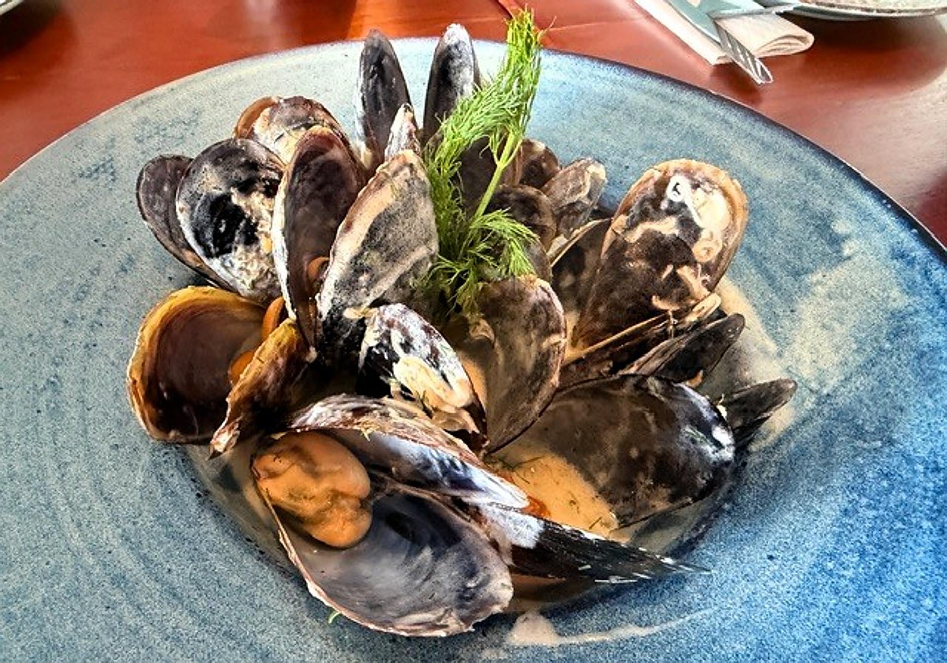 A light cream, but with a strong dill flavour, accompanies these medium-sized mussels. The dill cream is the link between flavour and juiciness, although the mussels should have been cooked for less time.