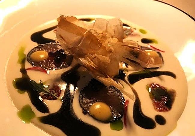Ajoblanco with cured tuna. An Andalusian dish that Milos restructures with figs, nori and a touch of katsuobushi or cured tuna that increases the salty touch of the ajoblanco itself and balances the sweetness of the figs. Very interesting.