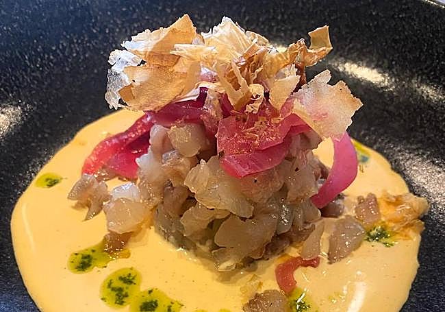 Sea bass tartare with summer gazpachuelo This is undoubtedly the star dish on the menu, according to the comments of the establishment's most regular customers. Very colourful thanks to the gazpachuelo base and with an impeccable cut of sea bass.
