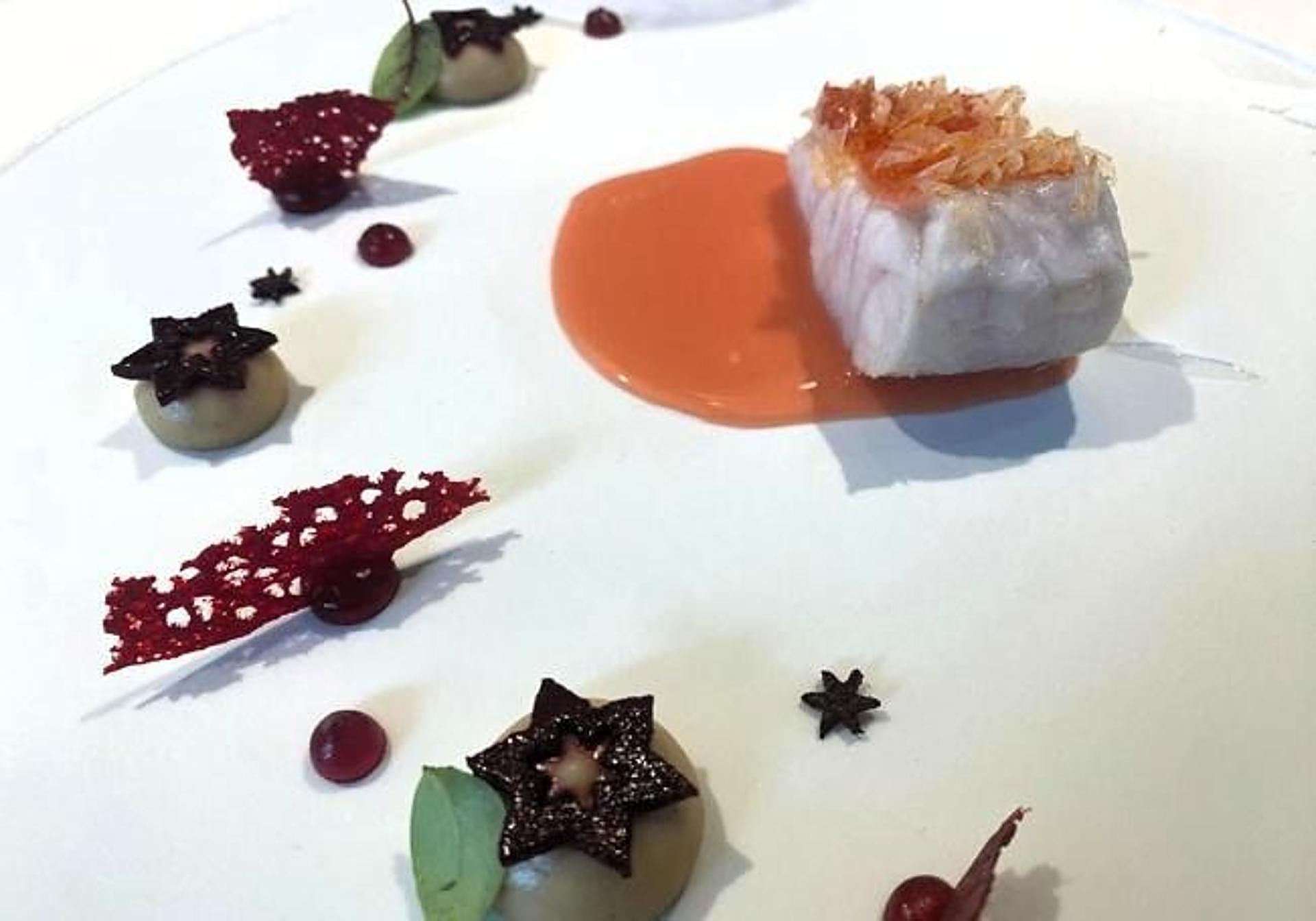 Virrey con meunière de ciruelas (Imperador with plum meunière). Colour combined with a minimalist presentation of a fish, the imperador (Beryx decadactylus), which is characterised by its semi-fatty flesh, is very fine on the palate. The plum meunière adds a fruity flavour to the dish as a whole.