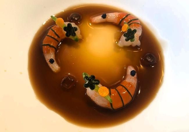 Carabinero con sopa en amarillo (carabinero prawn with yellow soup. Finesse is the word to define this fusion dish between a perfectly cooked carabinero (large deep-sea prawn), which is accompanied by seasonal peas to enhance the sweet touch and a saffron broth.