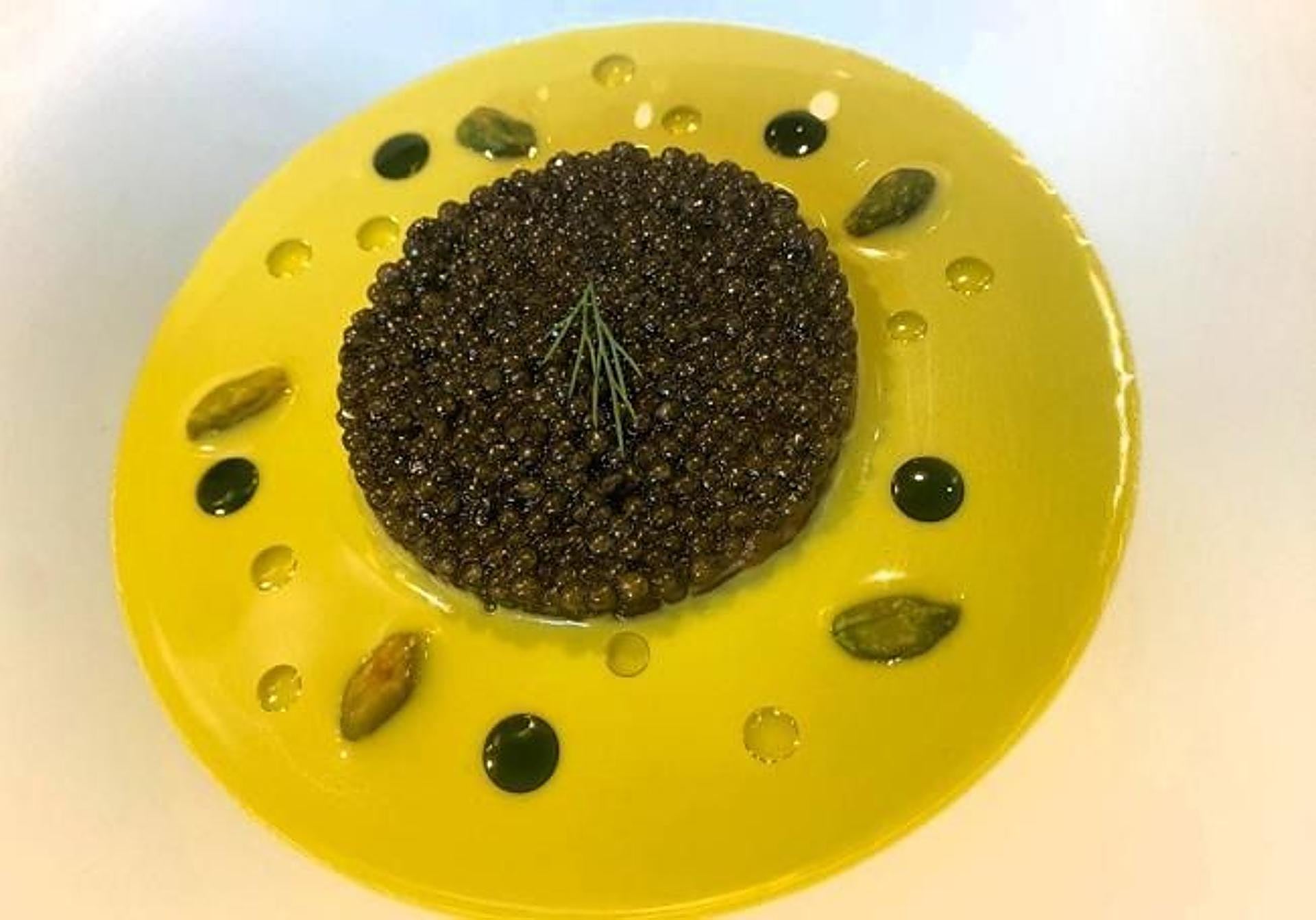Tartar de atún rojo y caviar (bluefin tuna tartare and caviar). This is, without a doubt, one of Skina's most iconic dishes in recent years. High quality bluefin tuna, sliced to perfection, which serves as the base for a caviar surrounded by a very smooth garlic and pistachio sauce.