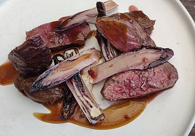 Tender beef with a pleasant salty touch is accompanied by braised endives to give it a slightly bitter note that contrasts with the sweet taste of the onion pâté. It is one of Álvaro's main dishes.