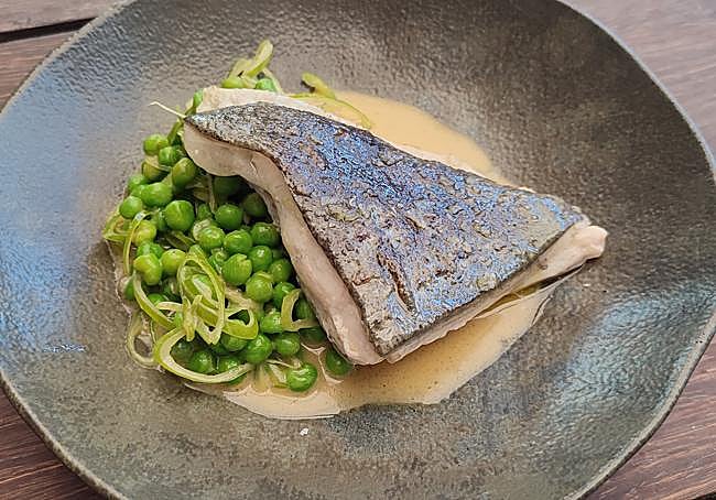 Good, medium-sized loin, just cooked in the oven, is accompanied by a smooth almond butter. The peas, lightly cooked, in addition to a very mild sweetness, add colour to the dish.