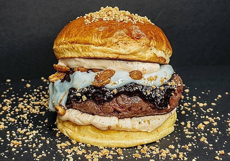 Steak House La Tombola (La Carihuela promenade, Torremolinos) dares with an innovative recipe composed of popcorn brioche bread, double smash burger of 45 days matured Angus, crispy bacon crystals, meringue crunch, pistachio cream, popcorn crunch and cheddar cheese cream.