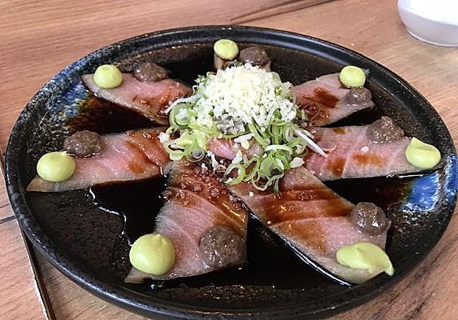 There are few secrets to this dish. It’s all about high-quality ingredients, the right cut and thickness of the tuna belly, and just the right additions to enhance the flavor and give the tuna a touch of salinity. Very good.