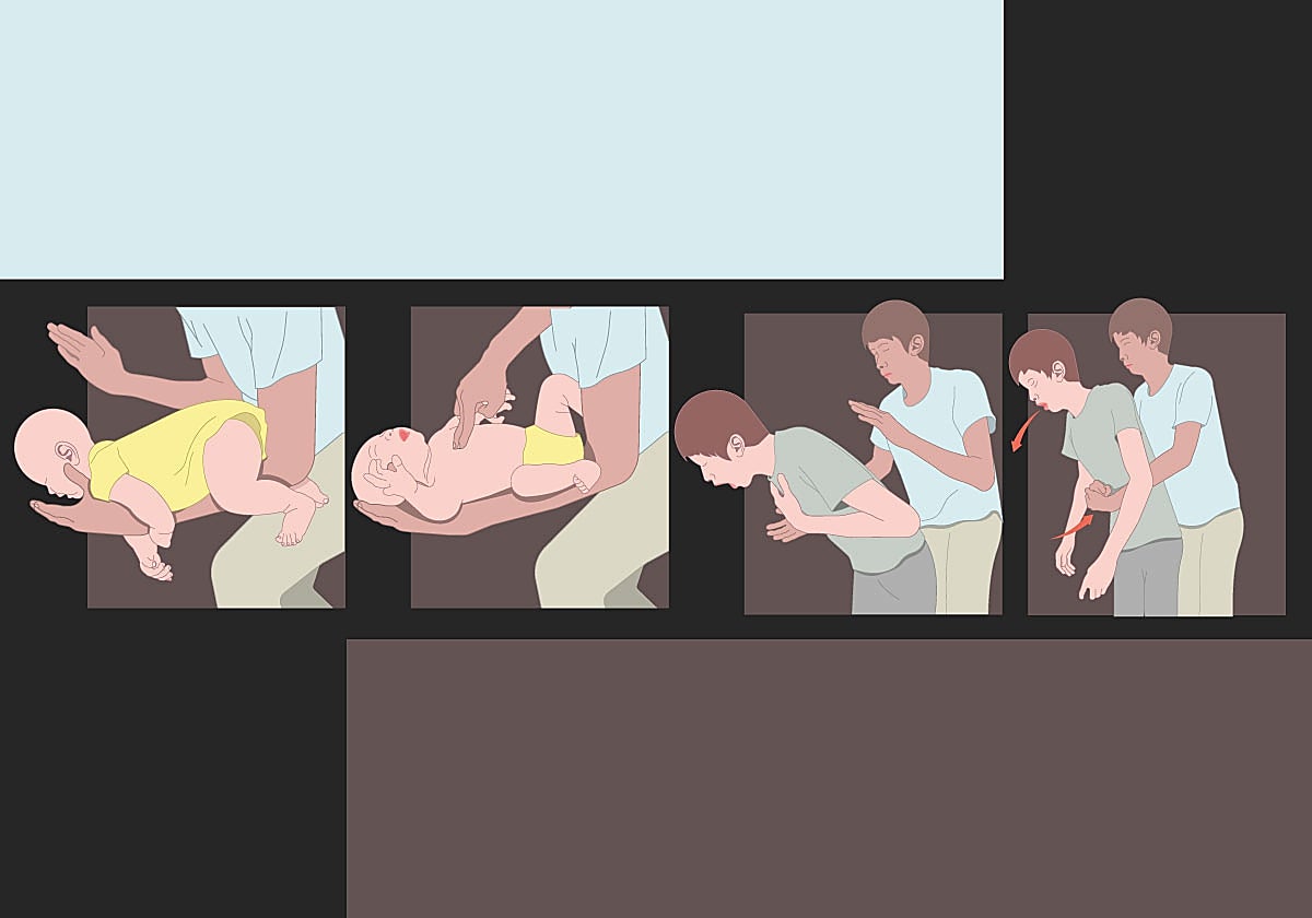 Manual removal of a foreign body is only indicated if the object is visible and easy to remove, as "we can further obstruct the airway and complicate its removal. If we can see it, we can remove it with a hooked finger," he stresses. In the case of babies, they should be placed face down on the forearm, with their head lower than the body and their jaw supported. Five firm blows should be given to the back, right between the shoulder blades with the heel of the hand. If that doesn't work, turn the baby face up, keeping their head lower than the body, and place two fingers in the centre of the chest, then give five quick and firm chest compressions. Then, alternate five back blows and five chest compressions. In the case of an older child, first try to get the child to cough up the foreign body by giving five back blows and then perform the Heimlich manoeuvre, which consists of rapid chest compressions to expel the foreign body.