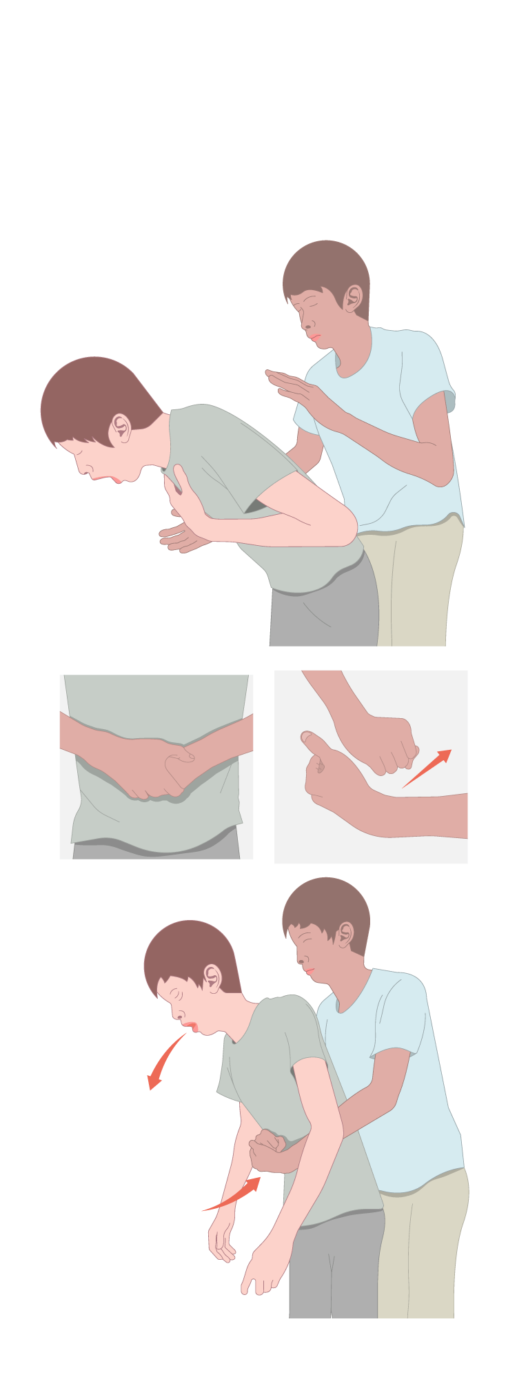 Dr Ángel García Alcántara, a specialist in intensive care, states that, in the event of an adult choking, the ideal response is to remain calm. "The best physiological mechanism for expelling a foreign body is coughing." You must encourage the person to cough. If that doesn't work, give five sharp blows on their back, "with their head tilted forward and, taking advantage of the fact that the victim is about to cough, deliver the blows to coincide with their movement". If the foreign body is still not expelled, perform the Heimlich manoeuvre: "This involves approaching the victim from behind, placing one fist above their navel and the other hand on top of that fist. Once in place, perform inward and upward compressions to increase and raise the diaphragm, thereby increasing intrathoracic pressure and dislodging the object." If that is ineffective, perform CPR until emergency services arrive.
