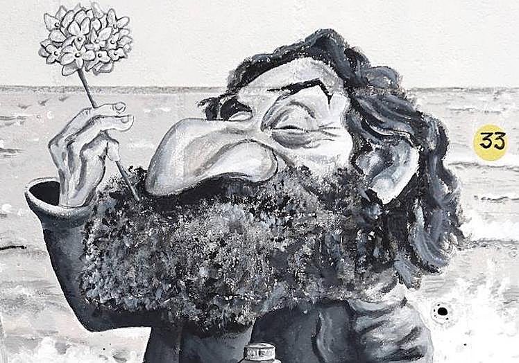"A must." No more words are needed. His shorts, his striped shirt and his iconic bald head speak for themselves in his caricature on the mural.