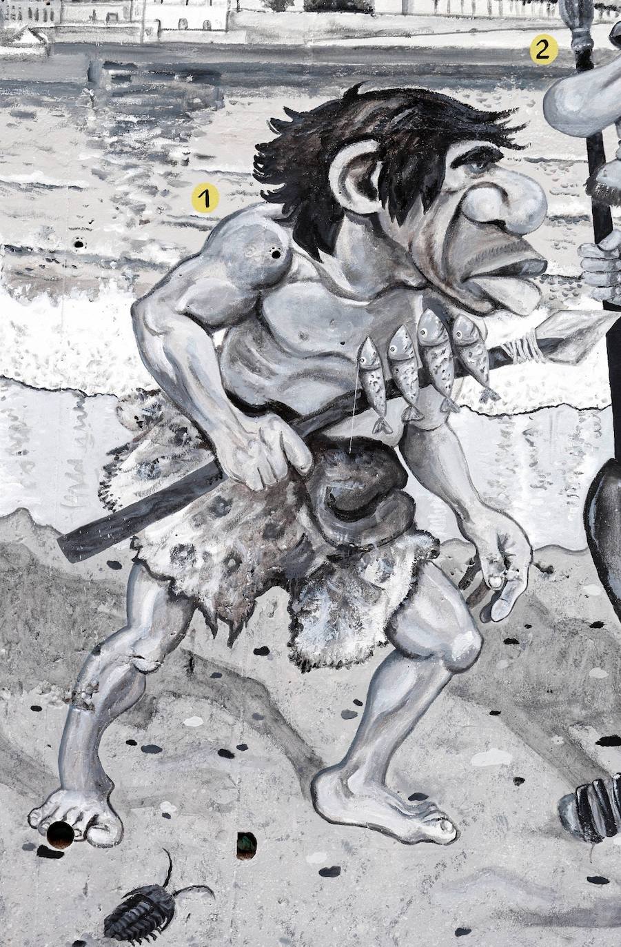 "To begin with, I drew a prehistoric man with a spear and I thought of putting some sardines on it and suddenly I discovered the inventor of the 'espeto' [he refers to the sardines grilled on skewers over an open fire at local beach bars]... and that's probably how it did start. My son also painted a trilobite underneath, a prehistoric creature that is the ancestor of our crustaceans."