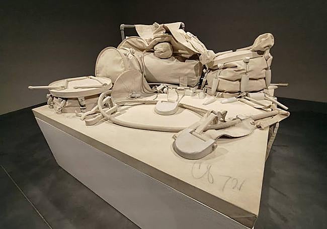 Claes Oldenburg's work stands out within pop art. His first soft sculptures appeared in 1962, in which he played with scale and material to create various colourful versions of a drum kit. In this 'ghost' version, he reproduces this instrument in fabric, which transforms into a flexible ensemble. As all vibration fades away, the work deflates and takes on a dimension that is as evanescent as it is evocative and ghostly.