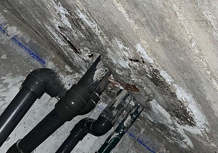 The source of the moisture should be discovered and an appropriate solution found to eliminate it. For a leak in the pool, this can be crack injecting which consists of steel plugs being drilled into the concrete at regular intervals and synthetic resin being injected at high pressure. The two-component synthetic resin is mixed directly on site and reacts very quickly. The advantage is that the material reacts in contact with water and stars foaming and increasing in volume considerably, especially in areas where there are open cracks, in the concrete filled with water. The process offers excellent results.