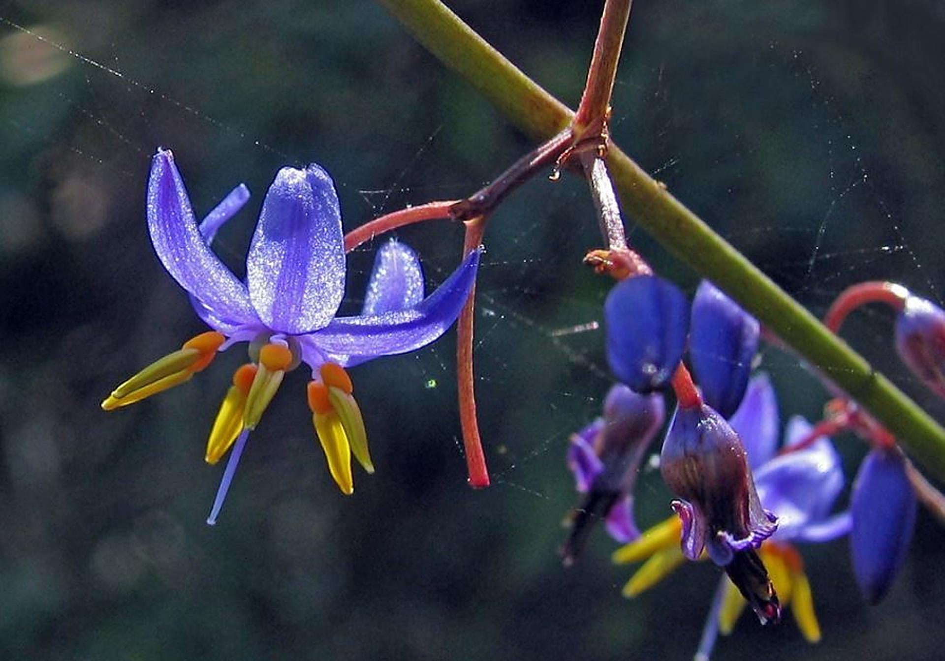 Common names for Dianella longifolia include pale flax lily but it is not a true flax (Phormium genus). It has long, thin, strap-like greyish-green leaves and tall spikes of purple or blue, star-like flowers, up to a metre high. After the flowers, attractive purple berries form which are edible and also loved by birds.