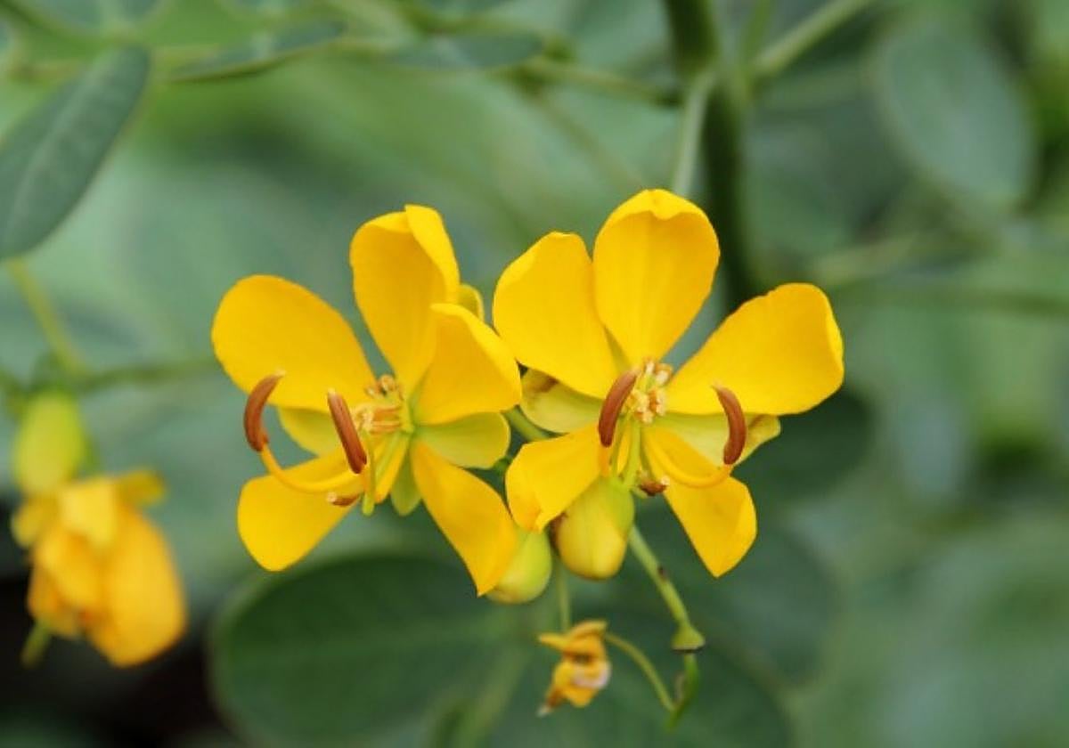 Senna (synonym Cassia) bicapsularis, commonly called rambling senna, butterfly bush or winter cassia, is a semi-evergreen shrub native to South America. A member of the Fabaceae (legume) family, it fixes nitrogen in nodules on its roots, enriching the soil naturally.