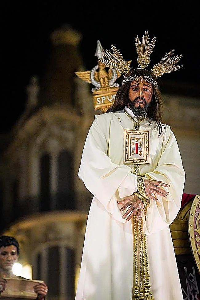 The following day, Holy Monday, dazzles in white. In Malaga, El Cautivo advances from La Trinidad in near silence. In Melilla, that same whiteness appears in Jesus Before Pilate (‘La Sentencia’). But there’s a twist: the float moves with a different rhythm, following the style seen in Seville. It feels like Andalucía in miniature, with Malaga at its heart and another way of moving in perfect balance.